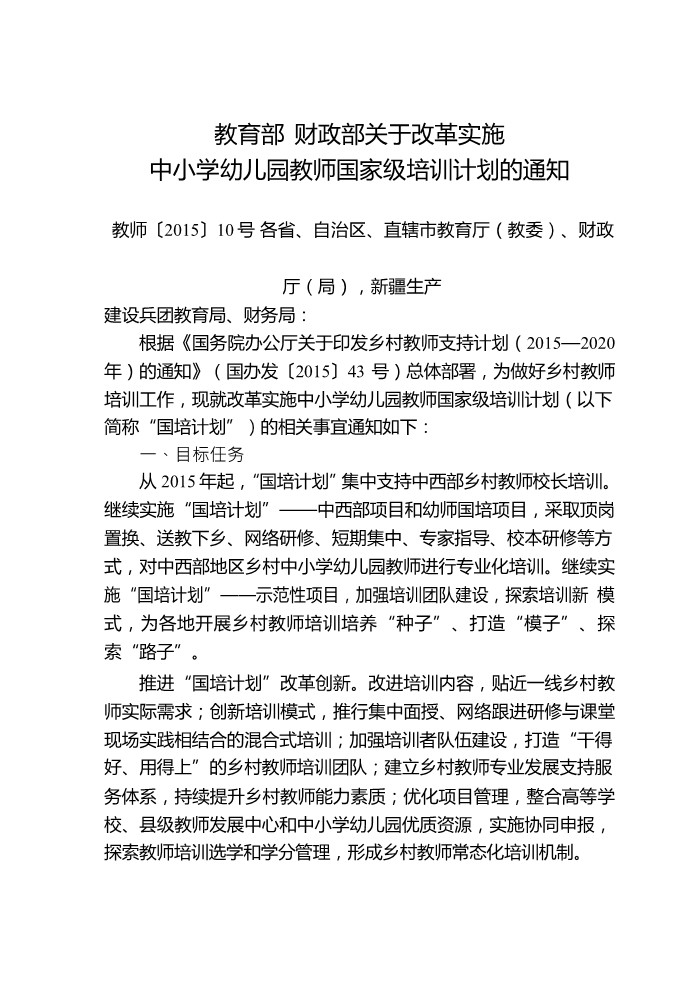 10. 教育部财政部关于改革实施中小学幼儿园教师国家级培训计划的通知(教师〔2015〕10号)