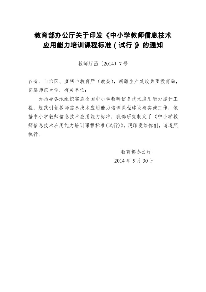22.教育部办公厅beats365官网 网页版《中小学教师信息技术应用能力培训课程标准(试行)》的通知(教师厅函〔2014〕7号)