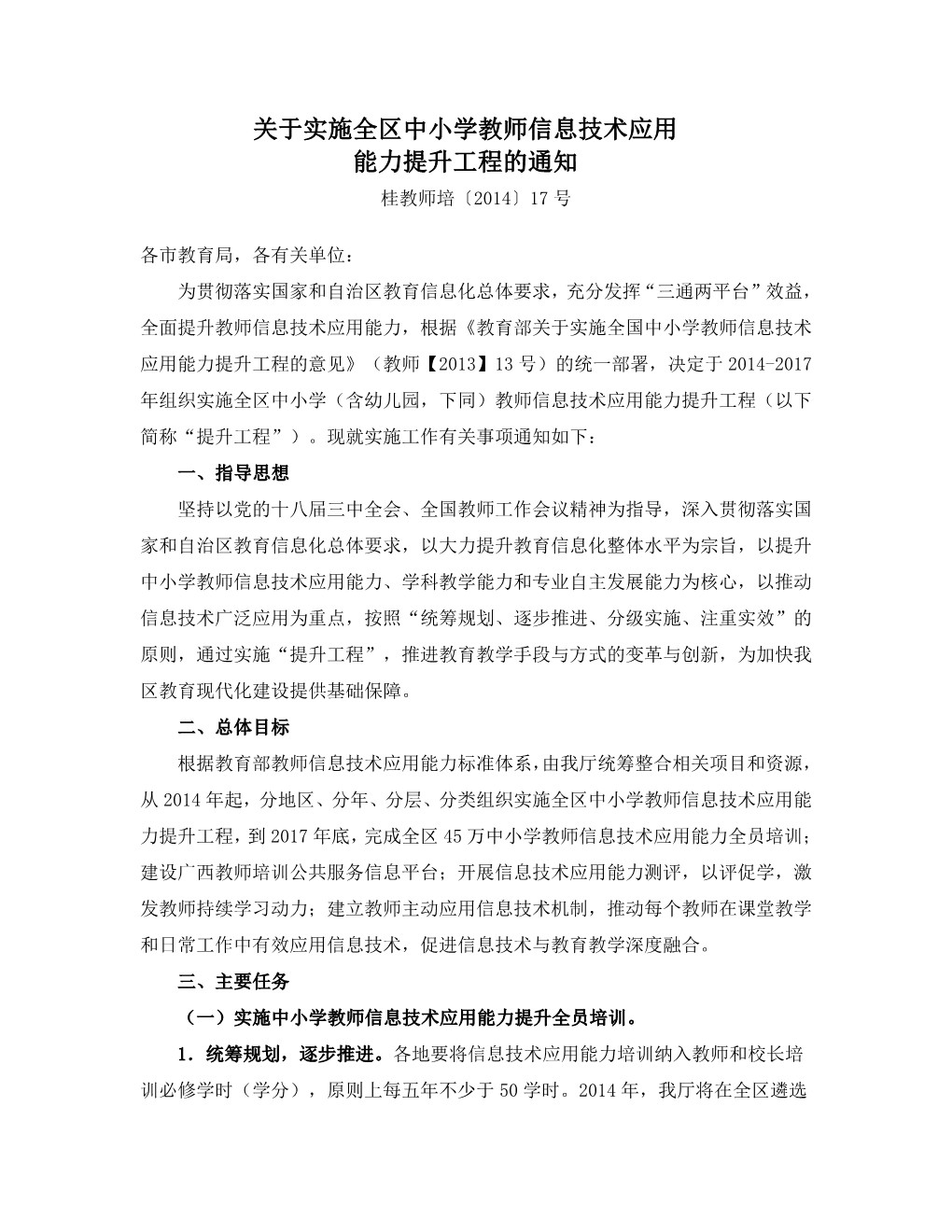 25.关于实施全区中小学教师信息技术应用能力提升工程的通知(桂教师培〔2014〕17号)