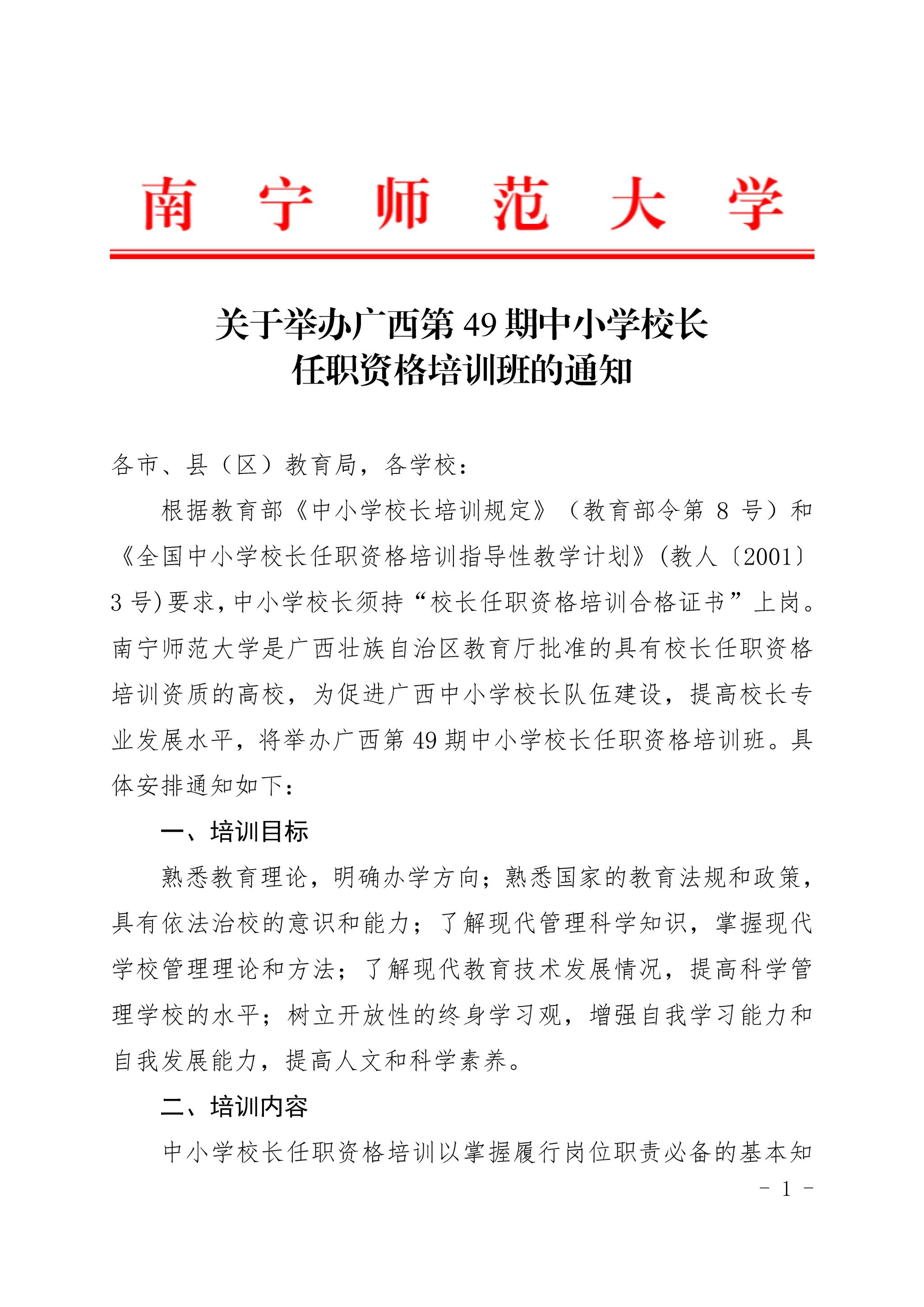 关于举办广西第49期中小学校长任职资格培训班的通知